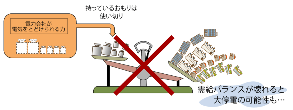 ここで重要なのが、電力の需給バランスは「同時同量」でなければならないという点です。「同時同量」とはつまり、電気をつくる量(供給)と電気の消費量(需要)が、同じ時に同じ量になっているということ。これらの量が常に一致していないと、電気の品質(周波数)が乱れてしまい、電気の供給を正常におこなうことができなくなってしまいます。その結果、安全装置の発動によって発電所が停止してしまい、場合によっては予測不能な大規模停電をまねく可能性があります。2018年9月に発生した北海道全域の停電“ブラックアウト”は、この電力需給バランスの崩壊が原因でした。