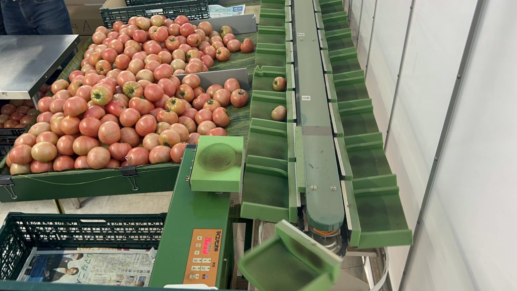 この機械により、一つ一つ違う重さのトマトが自動で分けられていきます。