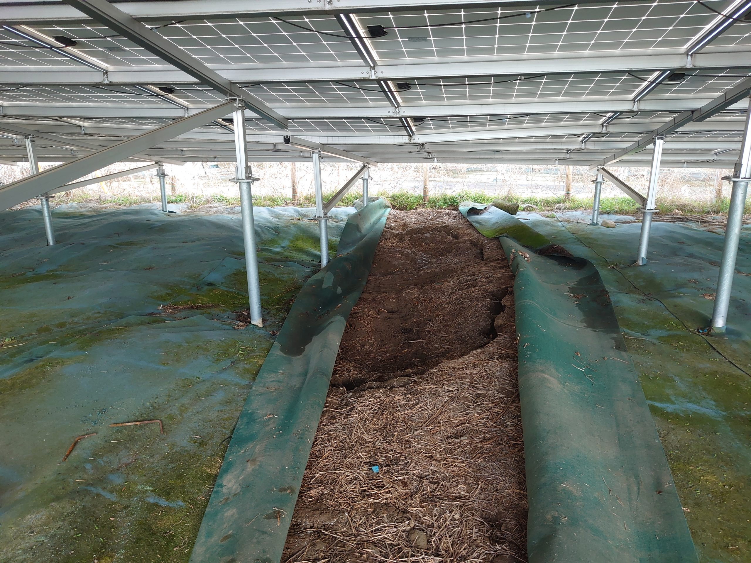 現地について、設備を確認した所、沈下の現象による架台の歪みを発見致しました( ;∀;)